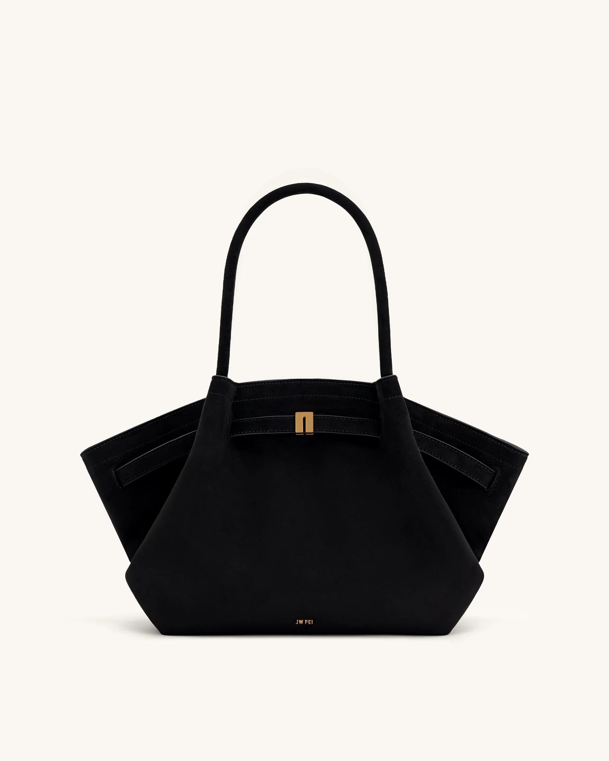 Crafted from luxurious vegan suede, this tote is all about style without compromise. With its bold silhouette and gold-tone details, it elevates any outfit instantly. Perfect for those who love chic minimalism but still want a bag that stands out.